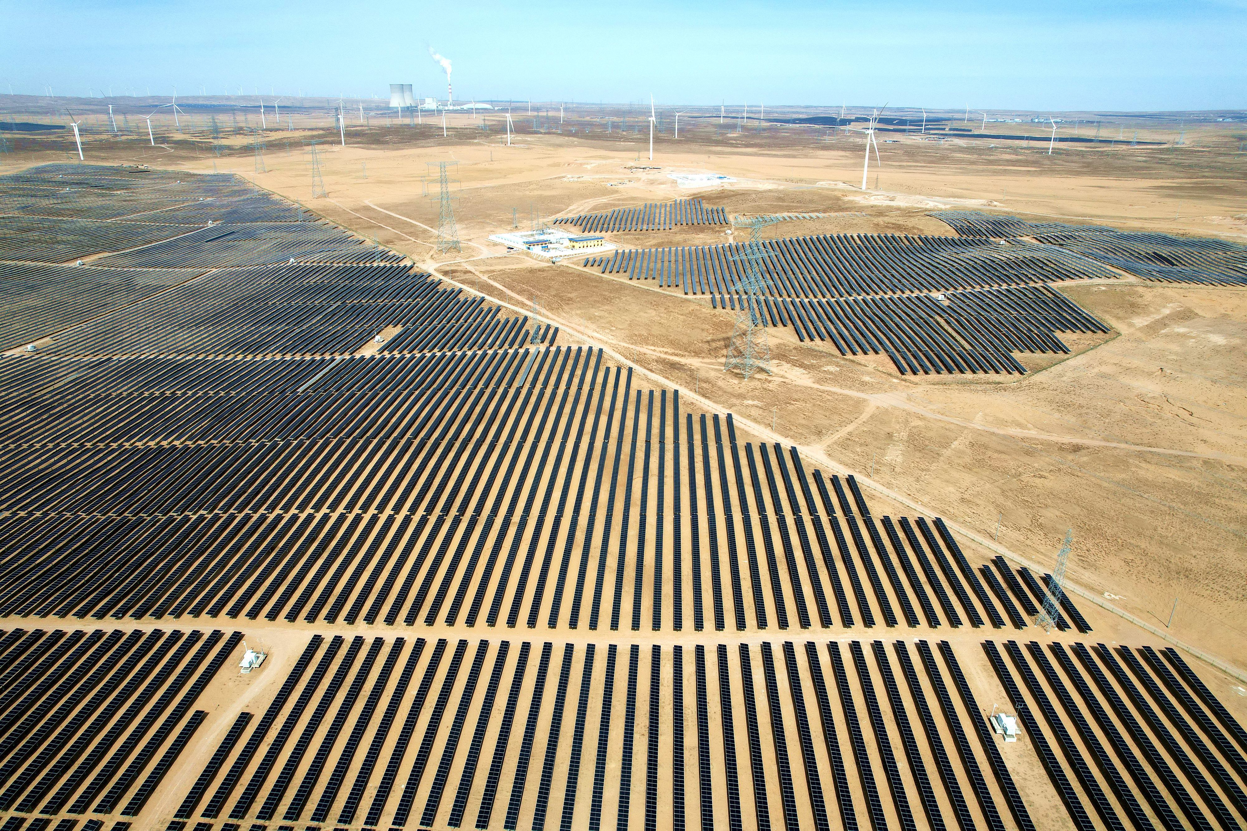 2026年3月18日,宁夏银川,在灵武市白土岗乡的一处光伏产业基地,成片的太阳能光伏板汇成一派“蓝色海洋”。