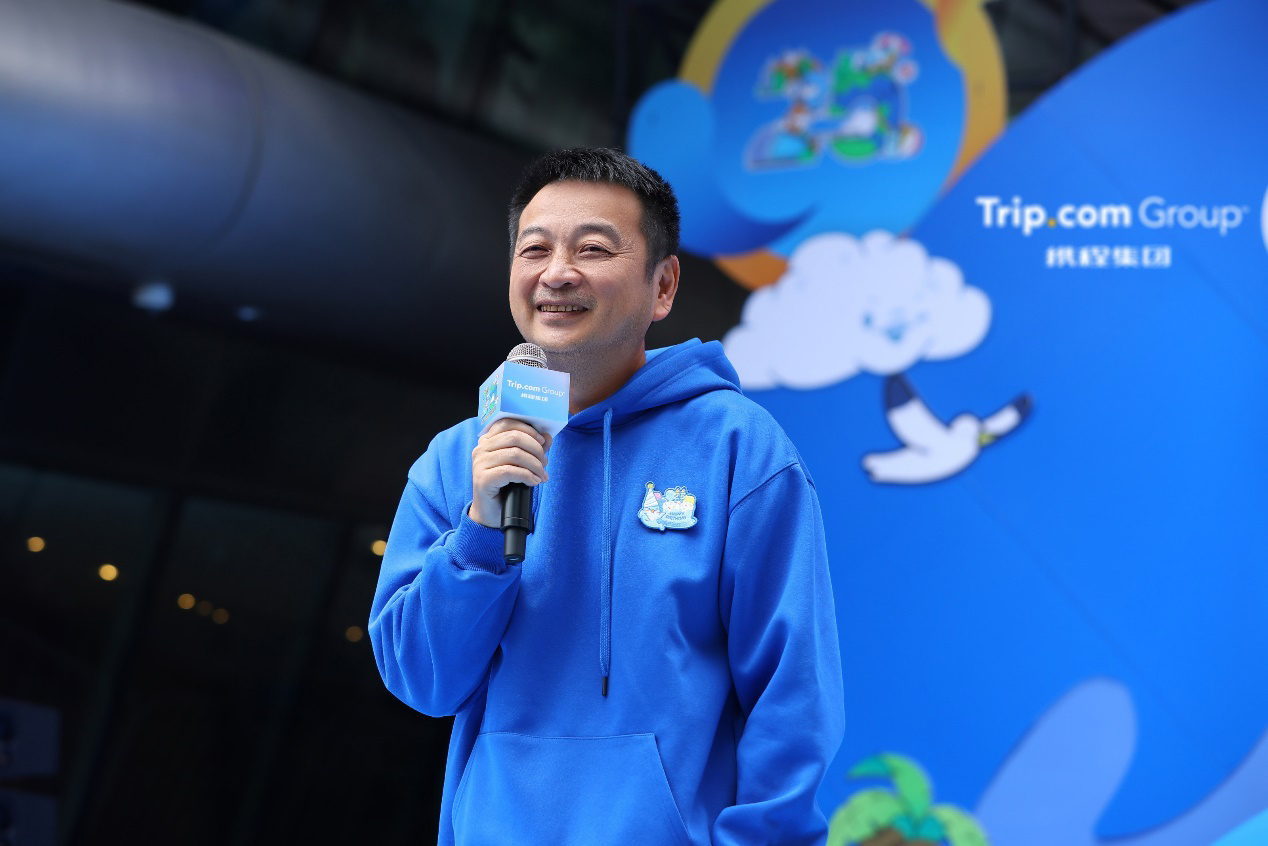 图为携程25周年典礼行为现场,携程集团聚会独创东谈主兼董事局主席梁建章致辞