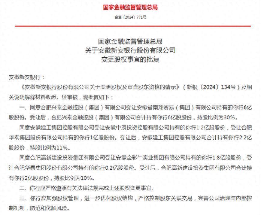 批复深刻,答应合肥兴泰金融控股(集团)有限公司(下称“兴泰金融”)受让安徽省南翔买卖(集团)有限公司(下称“南翔买卖”)抓有的新安银行6亿股股份;答应安徽建工集团控股有限公司(下称“安徽建工”)受让安徽中辰投资控股有限公司(下称“中辰投资”)抓有的新安银行1.2亿股股份,受让合肥华泰集团股份有限公司(下称“华泰集团”)抓有的新安银行1亿股股份;答应合肥高新设备投资集团有限公司(下称“高新设备”)受让安徽金彩牛实业集团有限公司(下称“金彩牛实业”)抓有的新安银行1.8亿股股份,受让华泰集团抓有的新安银行0.2亿股股份。